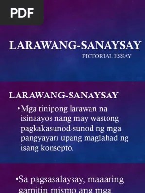 Ano ang kahulugan katangian layunin gamit at anyo ng larawang sanaysay. Nov 08, 2021 · pagsulat sa larawang sanaysay quarter 2 module 7 docsity. Ano ang photo essay o sanaysay ng larawan? Mga anyo ng larawang sanaysay o photo essay. Hindi tulad ng isang nakasulat na sanaysay, ang isang sanaysay sa larawan ay nakatuon sa mga visual sa halip na mga salita.