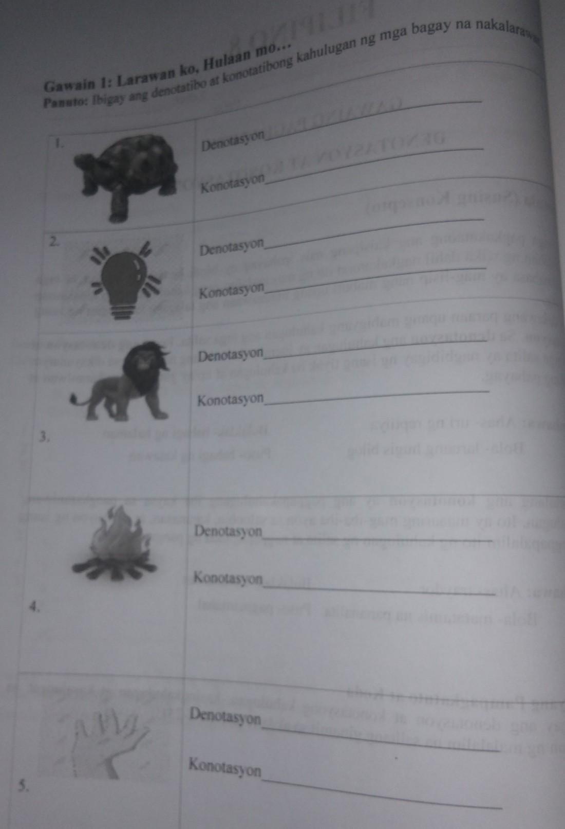 Sumulat ng pangungusap na maipakikita ang denotasyon at konotasyon ng mga salita. Denotasyon salita konotasyon ito ay ang nagpapakita ng larawan ng puso litrato ng puso simbolo ng pagmamahal at pagibig 8. 11/11/2021 · denotasyon o konotasyon ng larawan please? 23/09/2020 · denotasyon at konotasyon ng bato 1 see answer advertisement advertisement brainfreeze84 brainfreeze84 konotasyon: Di mamatay matay,may siyam na buhay. Litrato o isang uri ng bagay na kuha galing sa kamera o kung anuman. Semento o maliliit na kompawnd ng mga partikulo sa lupa, semento o gawa ng sedimentaryong proseso. Denotasyon at konotasyon pagtukoy sa pagpapakahulugang ginamit sa pangungusap. Ahas talaga ang taong iyan! 07/06/2019 · denotasyon salita konotasyon ito ay isang uri ng reptilya na minsa'y makamandag, subalit may ibang uri na hindi makamandang ahas isang taong traydor o tumitira nang patalikod ito ay ang nagpapakita ng larawan ng puso 7. Ang denotasyon ng papel ay ang literal na kahulugan nito: Advertisement advertisement new questions in filipino. Isang uri ng materyal galing sa mga puno o dahon na pangunahing ginagamit bilang panulat, at sa iba't ibang industriya.